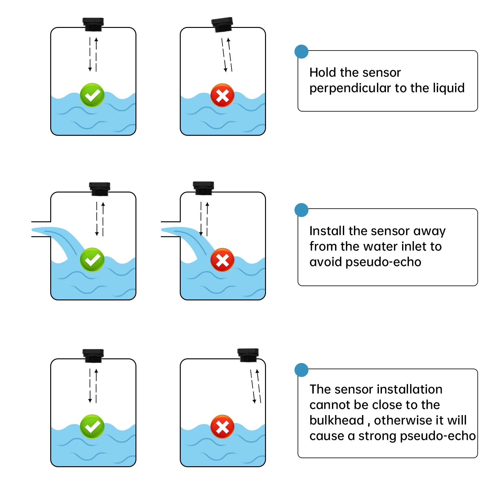 Le capteur doit être au milieu du réservoir et non sur une entrée de liquide.Cela peut fauxfier le résultat de la mesure.Veuillez vous référer aux images suivantes pour les meilleures positions d'installation.Le trou doit être de 58 mm